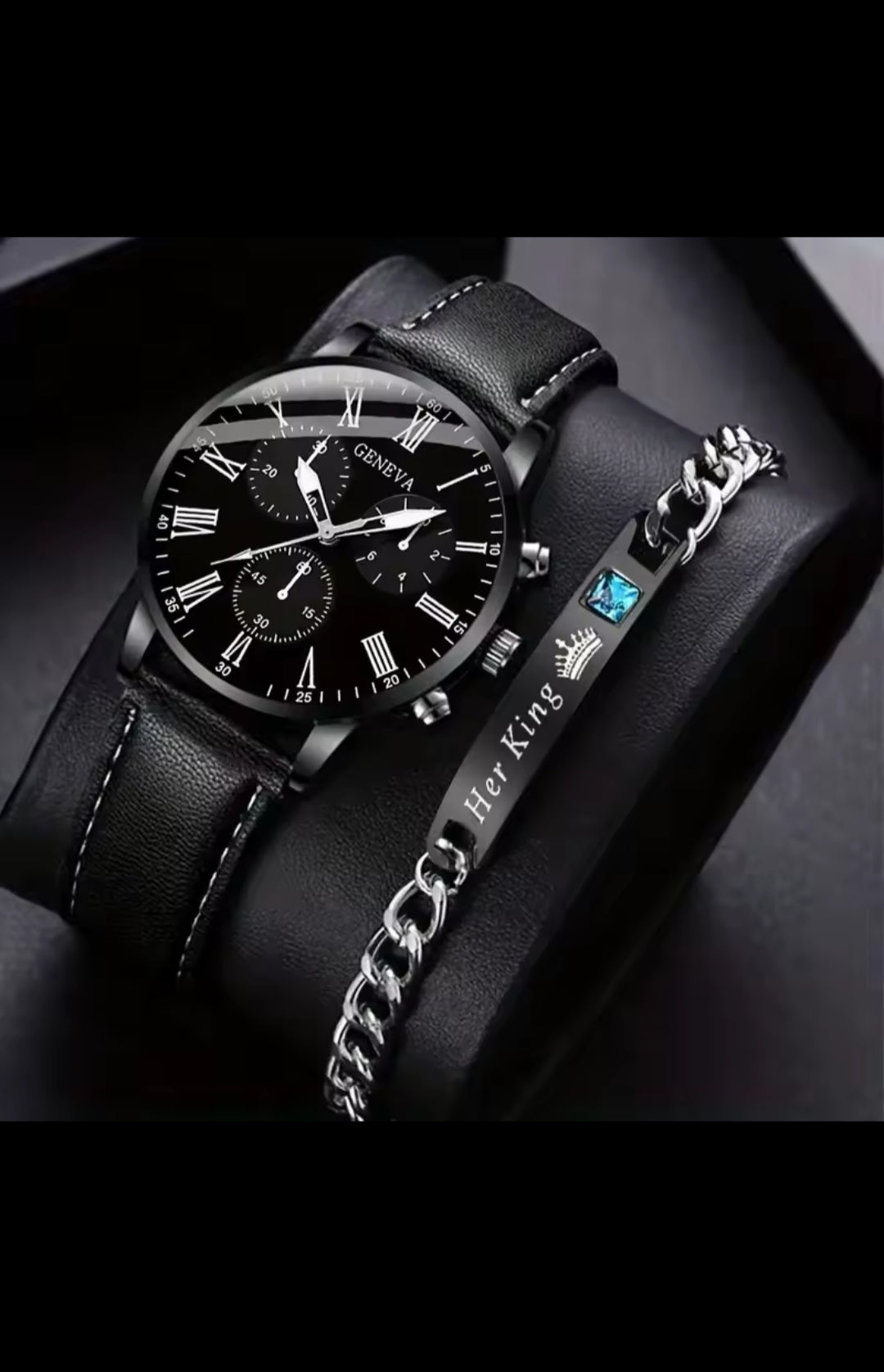 Upgrade your style with this premium Geneva wrist watch and bracelet set. Featuring a sleek black dial with Roman numerals and chronograph-style sub-dials, this watch delivers a perfect blend of classic and modern design. The comfortable leather strap ensures all-day wear, while the matching stainless steel bracelet adds a touch of luxury. Ideal for daily wear, office use, parties, and gifting. A perfect choice for men who value elegance and durability.